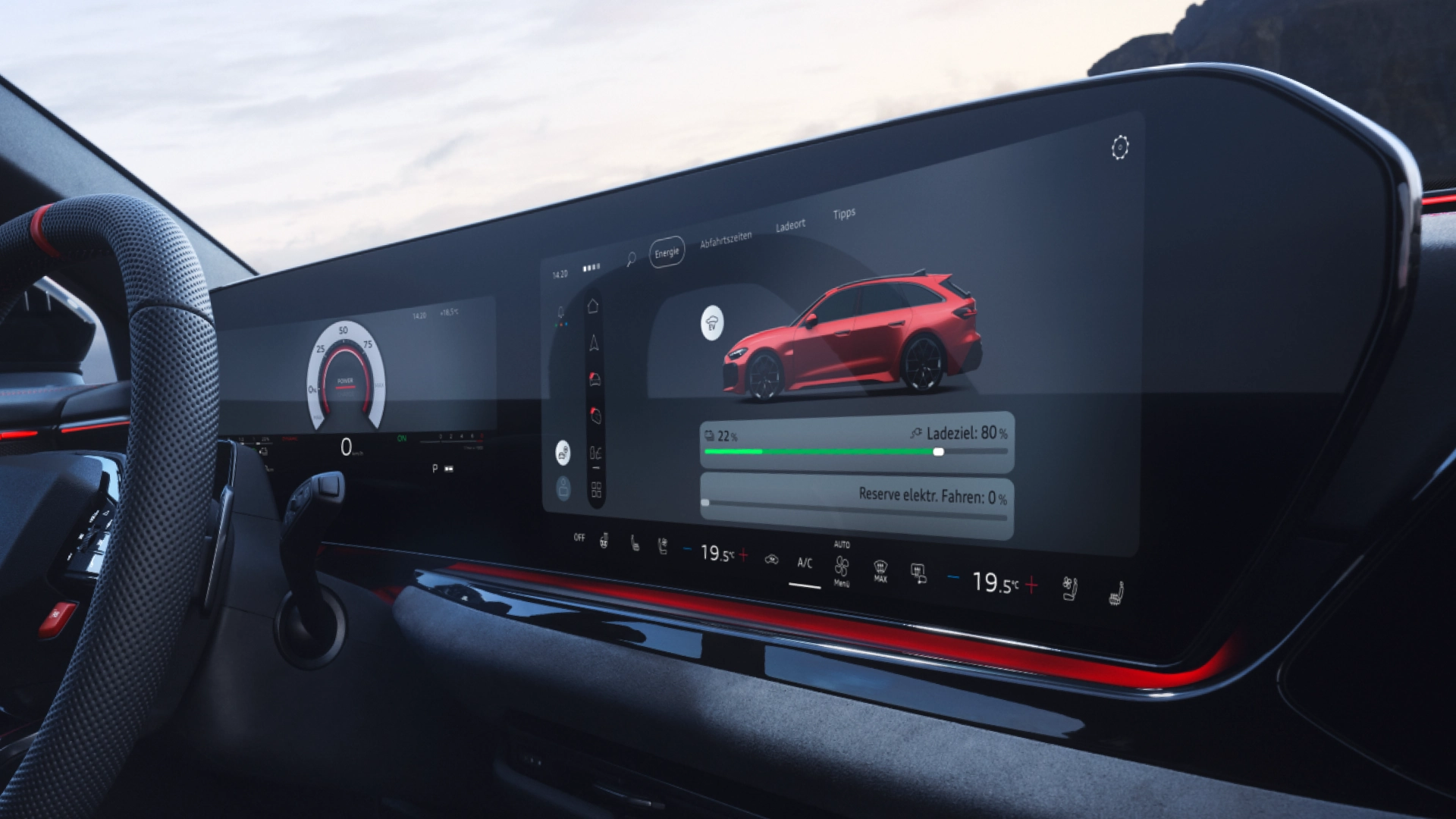 In the MMI, you can select between the fully electric EV driving mode and the hybrid mode, which combines the electric motor and the combustion engine. In hybrid mode, a slider can also be used to set the desired target battery charge level, provided it is activated in time.