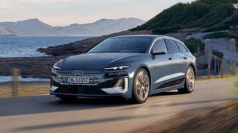 Relaxed driver enjoys the sleek Audi EV interior with digital dash and scenic waterfront view.